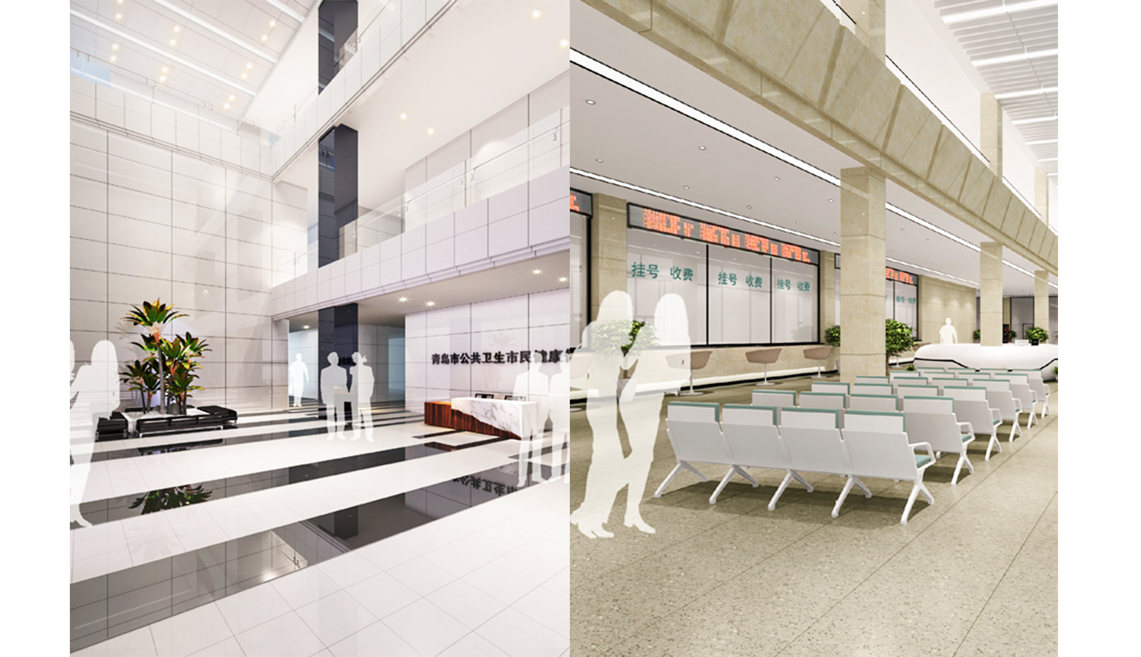 結(jié)合周邊的環(huán)境和節(jié)省造價(jià)的因素綜合考慮,建筑立面為干凈簡(jiǎn)潔的現(xiàn)代風(fēng)格,臨床中心以橫向線條為主,公共衛(wèi)生中心以豎線條為主,市民健康體驗(yàn)中心強(qiáng)調(diào)建筑的標(biāo)志性;建筑平面主要解決不同功能的區(qū)域劃分和避免流線交叉的問題。