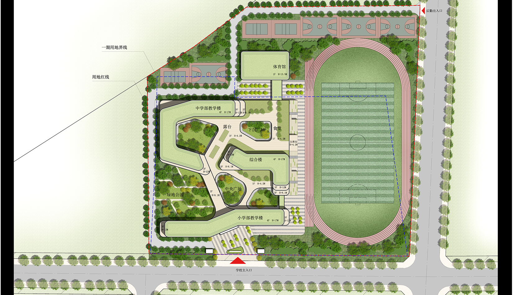 學(xué)校整體布局呈"S" 形,由南向北布置,經(jīng)南北連廊串聯(lián),與平臺一道形成多層次的綠軸體系,讓孩子們在綠色的學(xué)習(xí)環(huán)境中喜獲豐收。