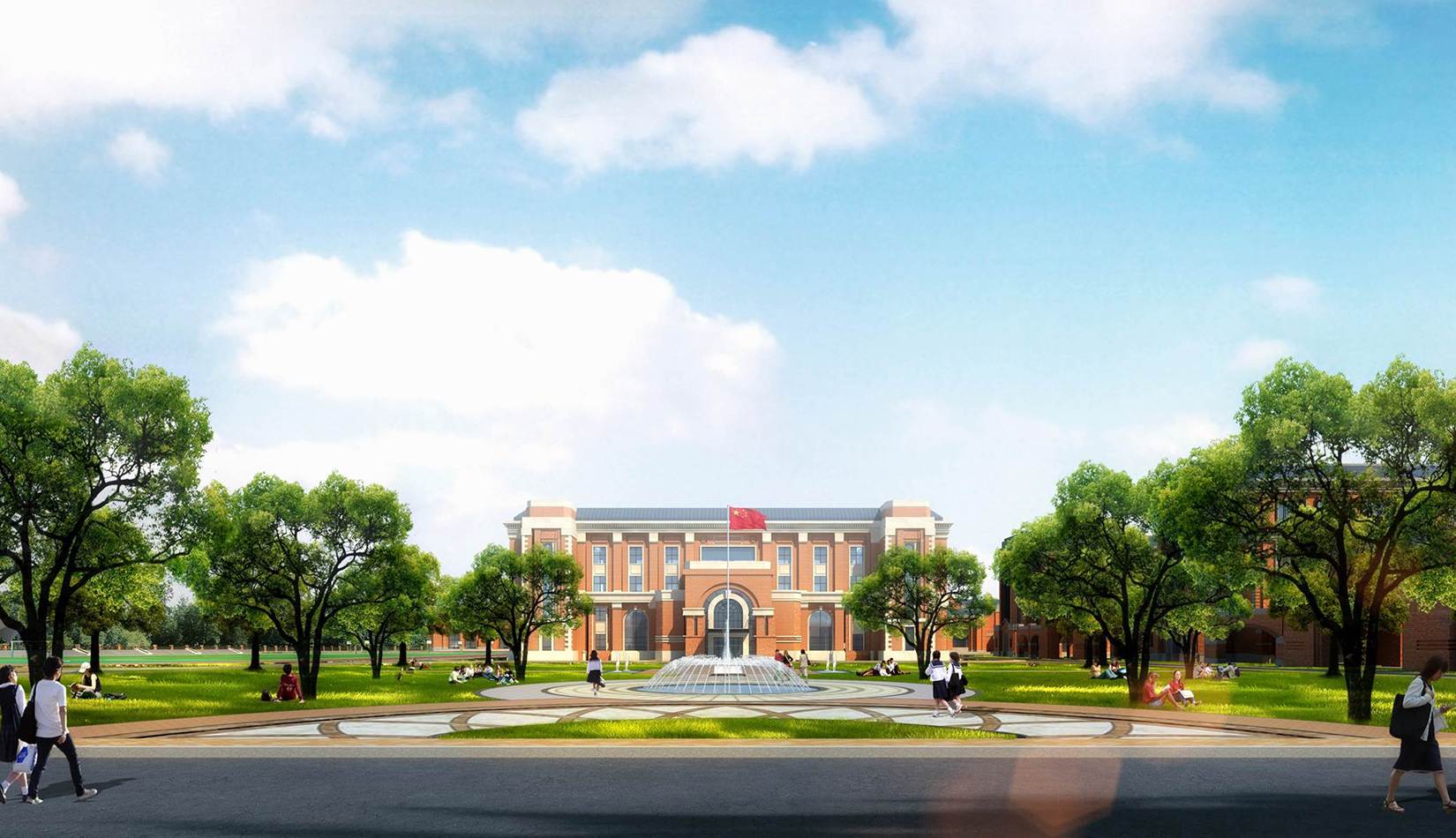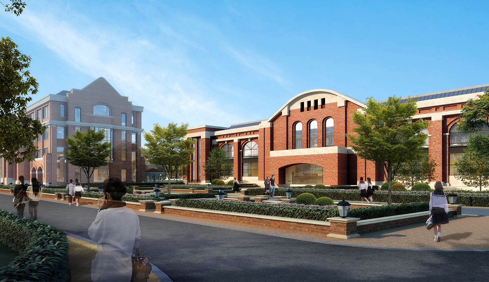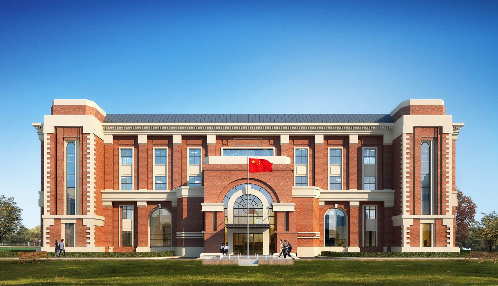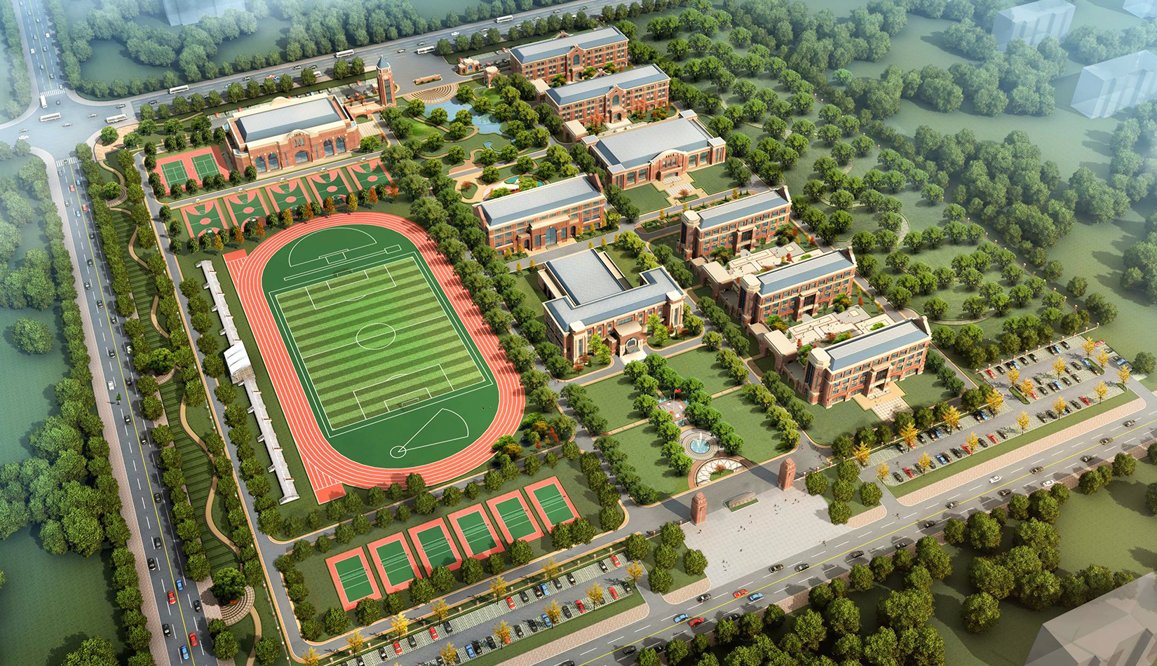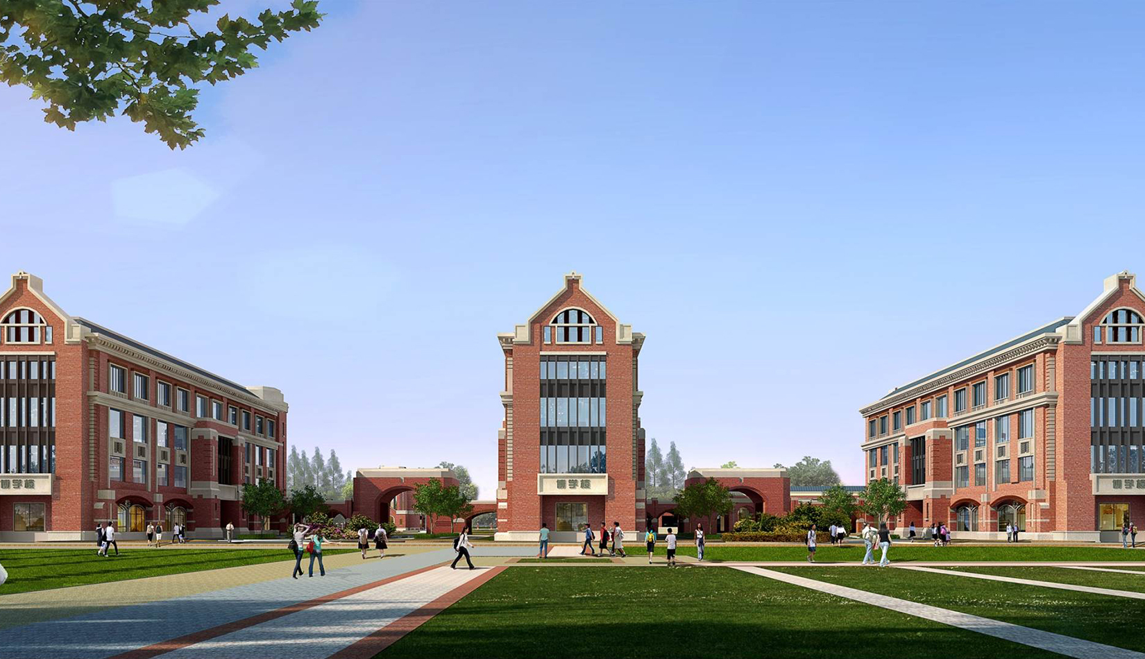 分區(qū)設計上,采用了“前場后園”的設計手法。前區(qū)以教學區(qū)為主,圍繞中心圖書綜合樓形成前區(qū)禮儀性廣場,同時以中軸對稱為原則,體現(xiàn)了教學的嚴肅性與秩序性;各個教學單元以年級、功能就近布置為基本原則,以中國傳統(tǒng)的“院落”形式進行組合,后院生活區(qū)借鑒了“山水園林”的布局手法,結合中心景觀,進行自由化布局,達到景入園中、人在景中生活場景,使學生在學習之余,得到充分的放松。