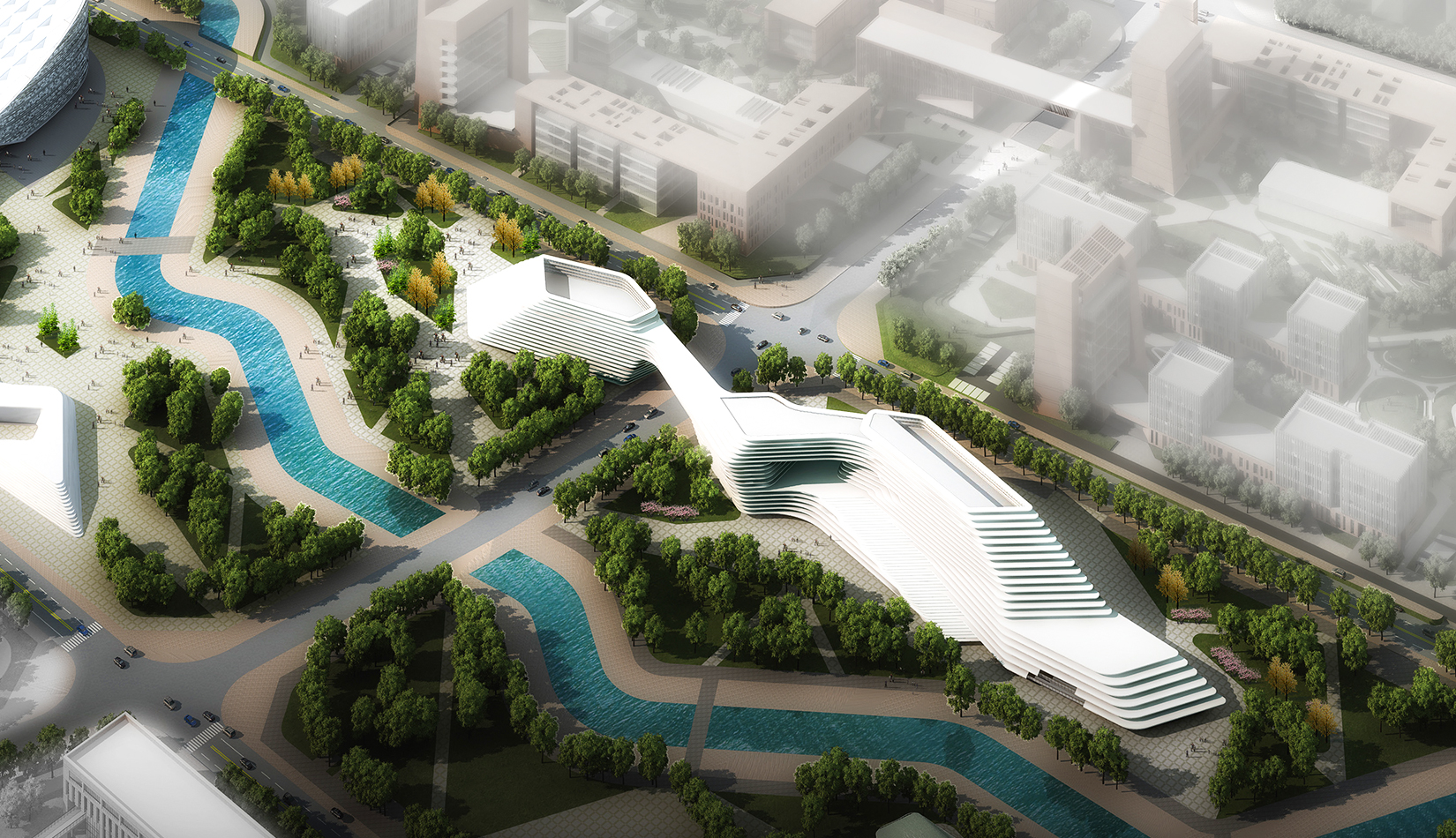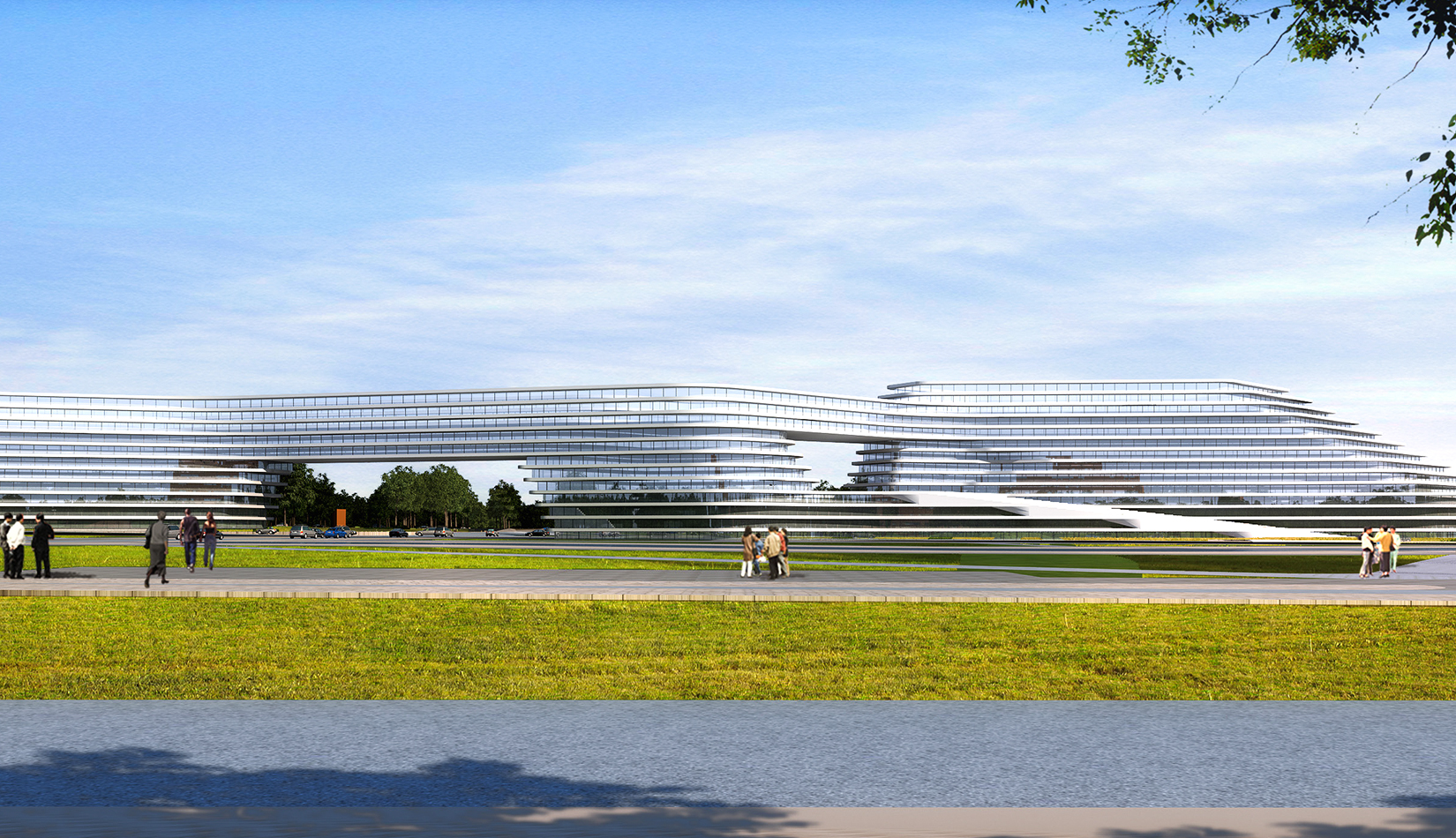 科學(xué)講堂位于中心區(qū)景觀主軸的中心腹地,其南的泄洪渠為景觀主軸的景觀帶。設(shè)計(jì)靈感源于中國天人合一的自然觀和社會(huì)觀,所謂仁者樂山智者樂水,通過對(duì)山、水肌理的分析與重構(gòu),轉(zhuǎn)換為建筑語言,形成獨(dú)具特色的建筑造型。建筑體量形成簡單、沖突的場(chǎng)地氛圍,建筑南向正對(duì)園區(qū)中軸線,使得水平向延展的建筑生成了“東高西低”的無邊際界面。由“水面→河岸→場(chǎng)地→建筑”的溪水肌理驅(qū)動(dòng)建筑臨街面,逐步退后產(chǎn)生特有的河流沖刷意象。水流的蜿蜒曲折使建筑的轉(zhuǎn)彎處成洞,達(dá)到了內(nèi)外視線連續(xù)的綜合效果,并將對(duì)建筑的擠壓力平衡到建筑東西兩翼。建筑表皮通過對(duì)水的情緒變化等模擬,形成片狀的建筑造型。