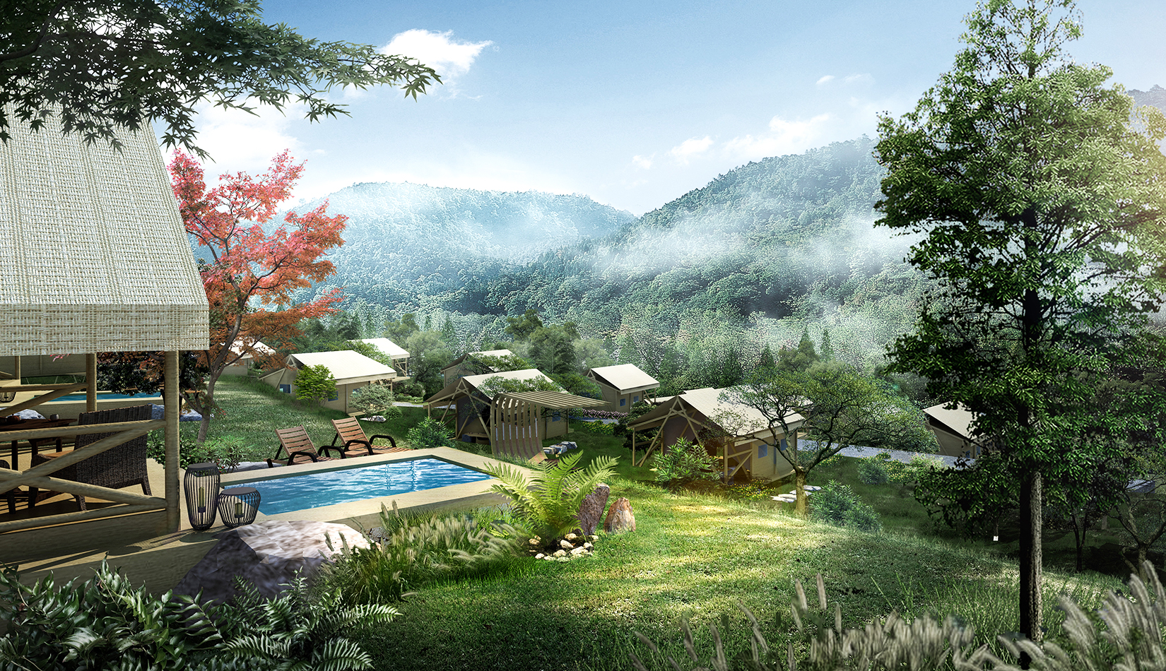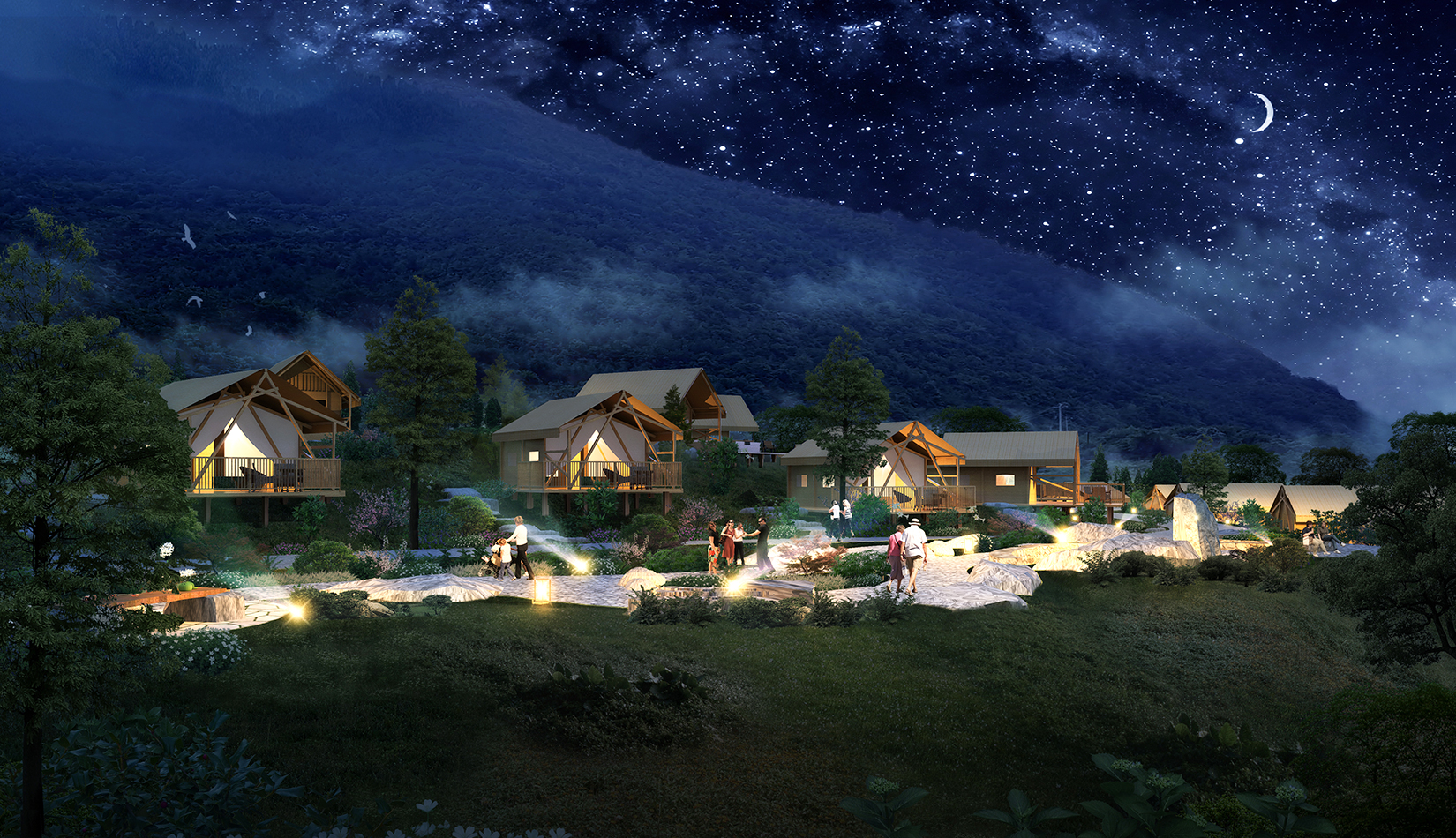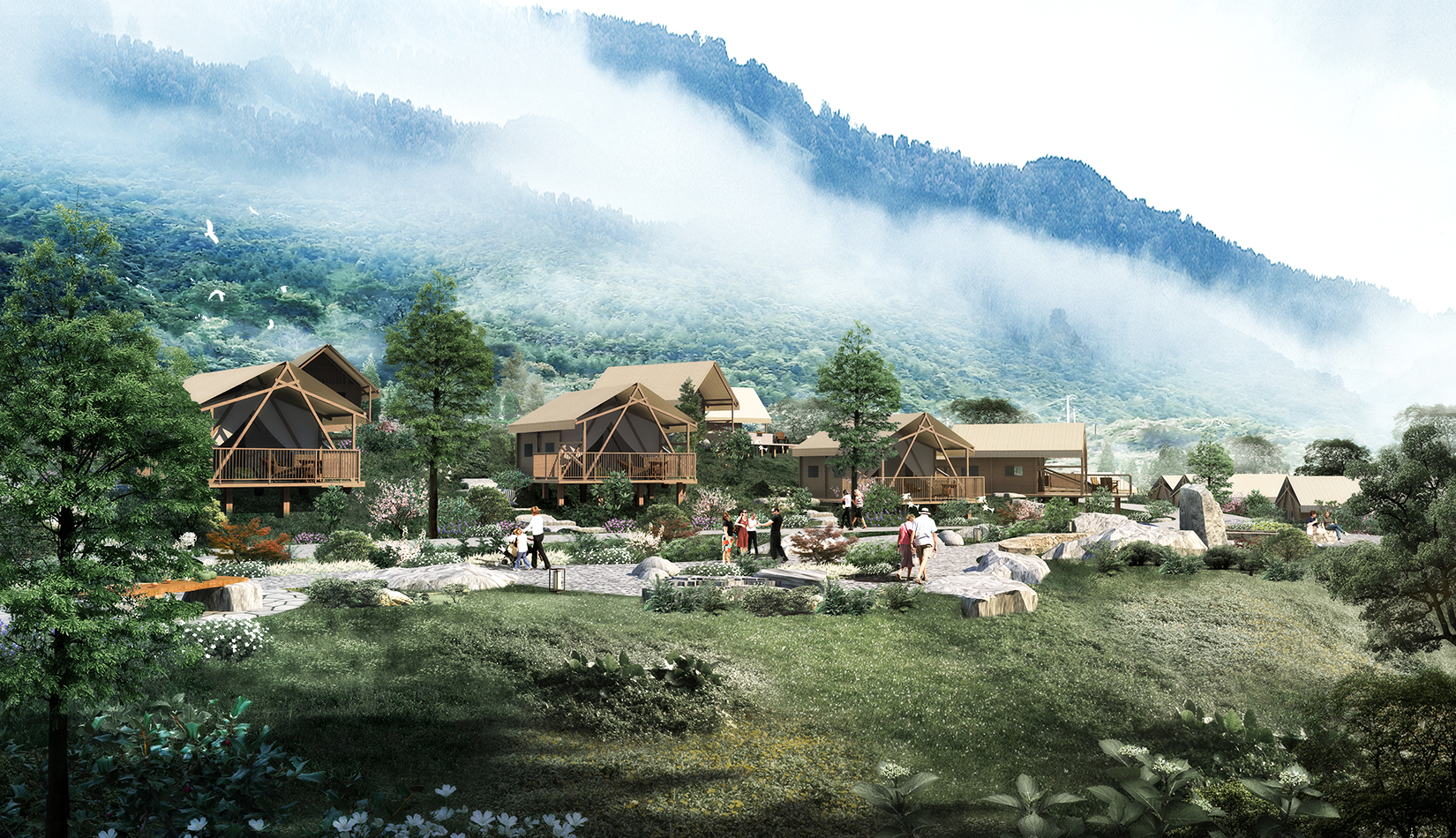 根據(jù)基地的地勢分布及功能需求,空間結(jié)構(gòu)上分為“一帶兩軸三核心五組團”。建筑設(shè)計的五個組團,分別是濱水休閑組團、水畔風(fēng)光帳篷組團、高端養(yǎng)心帳篷組團、中心服務(wù)組團及山居野趣帳篷組團。客房部分采用帳篷度假屋的方式,凸顯野奢度假的浪漫形式。