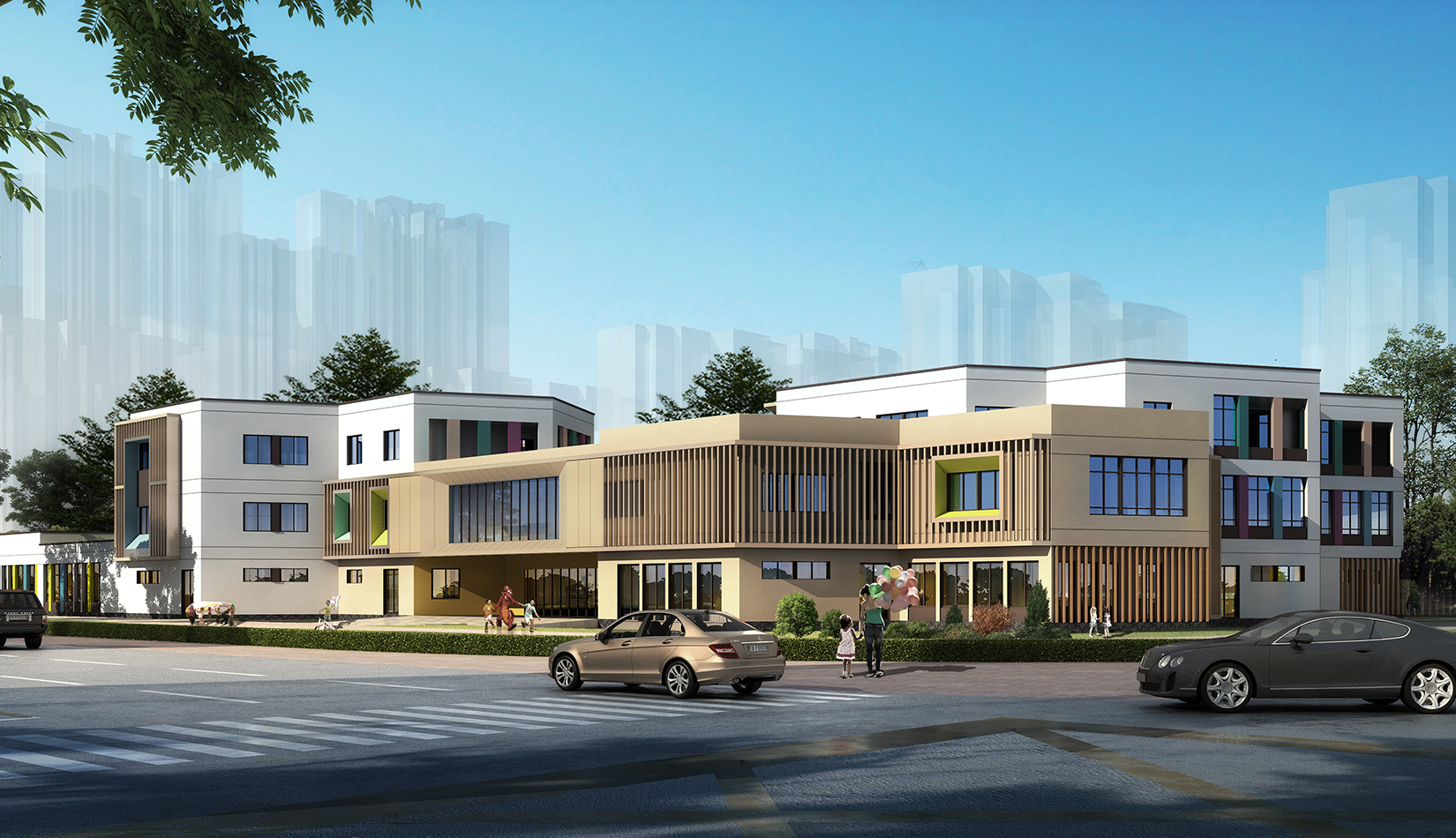 整體建筑以暖色調(diào)為主,旨在為幼兒營造一種溫馨的環(huán)境氛圍,以紅色陶土板為基調(diào),與周邊古典風(fēng)格的住宅區(qū)相融合。彩色的運用象征著孩子活潑多彩的個性,迎合了孩子對色彩的敏感特性,營造出一種五彩斑斕的活潑的環(huán)境氛圍;彩色具有強調(diào)作用,可以突出建筑作為幼兒園的功能性,同時白色作為整體環(huán)境的基調(diào)色,協(xié)調(diào)了不同色彩間的沖突感受,使建筑氛圍呈現(xiàn)簡潔明凈而又突顯夢幻的特點。