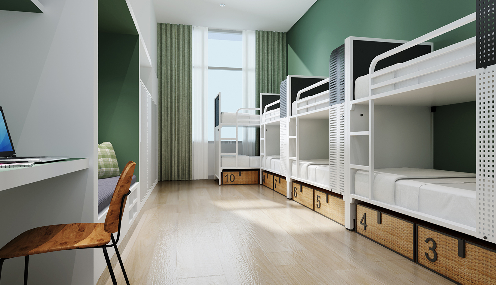客房采用木色為空間主色調(diào),巧妙利用上下床與衣柜的組合排列方式構(gòu)建出一個(gè)簡(jiǎn)潔精致的精品化公寓。