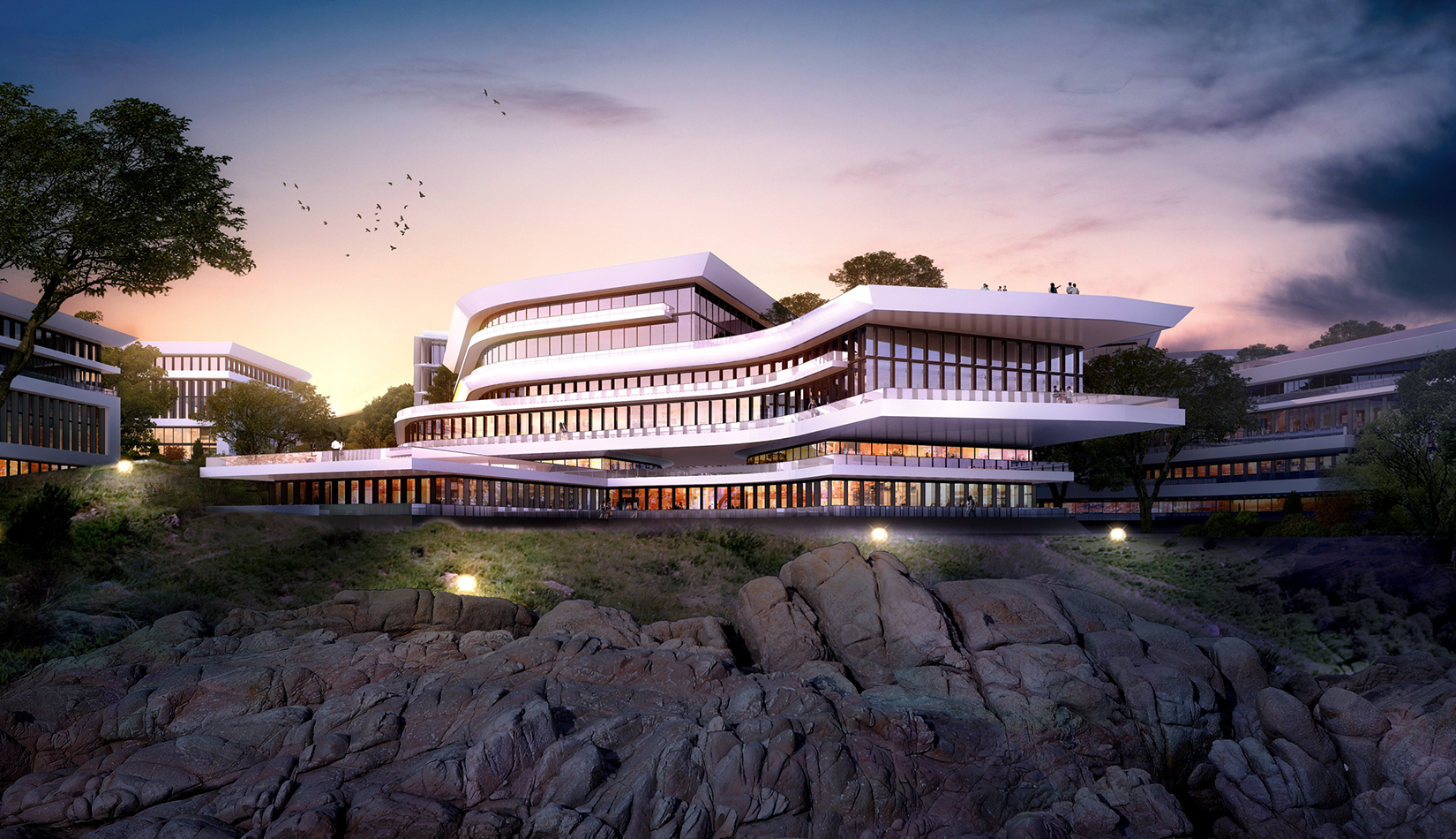 建筑立面采用疏密有致的格柵化立面,凸顯了預(yù)警基地的嚴(yán)肅性;白色流線(xiàn)型屋頂順應(yīng)地勢(shì),給建筑賦予現(xiàn)代的海洋氣息。不同的建筑功能合理布局,沿海建筑采用退臺(tái)的建筑手法,沿海岸線(xiàn)立面生動(dòng)活潑。