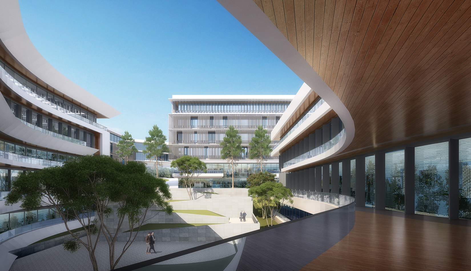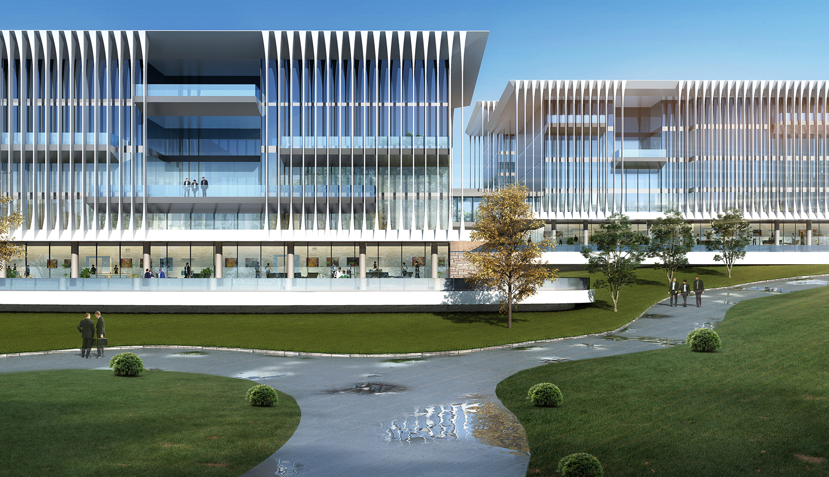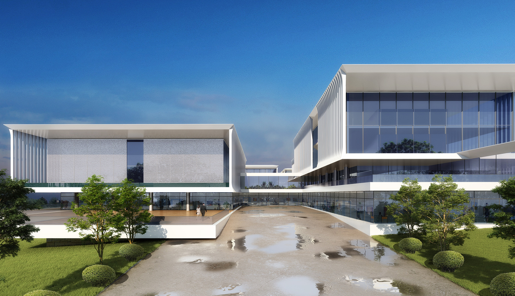 簡(jiǎn)潔大氣的豎向橫向劃分,使MECS主樓充滿(mǎn)海洋氣息;白色流線(xiàn)型屋頂順應(yīng)地勢(shì),自由舒展。流線(xiàn)型的體塊靠近海岸線(xiàn),表達(dá)科研人員的探索精神,并且與地勢(shì)相結(jié)合。