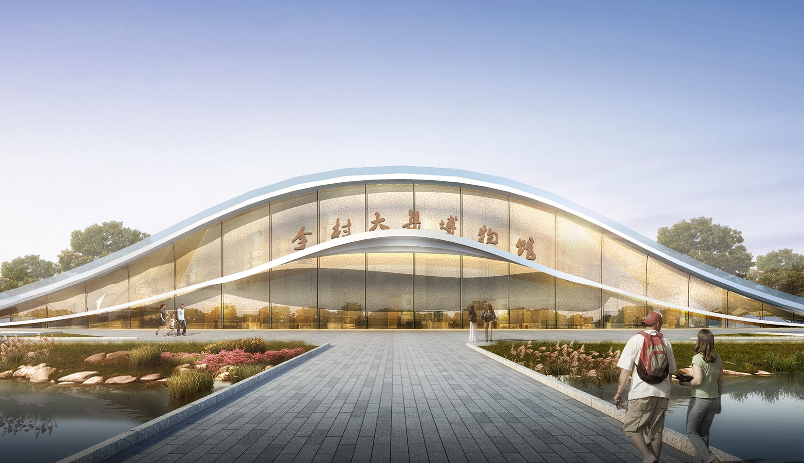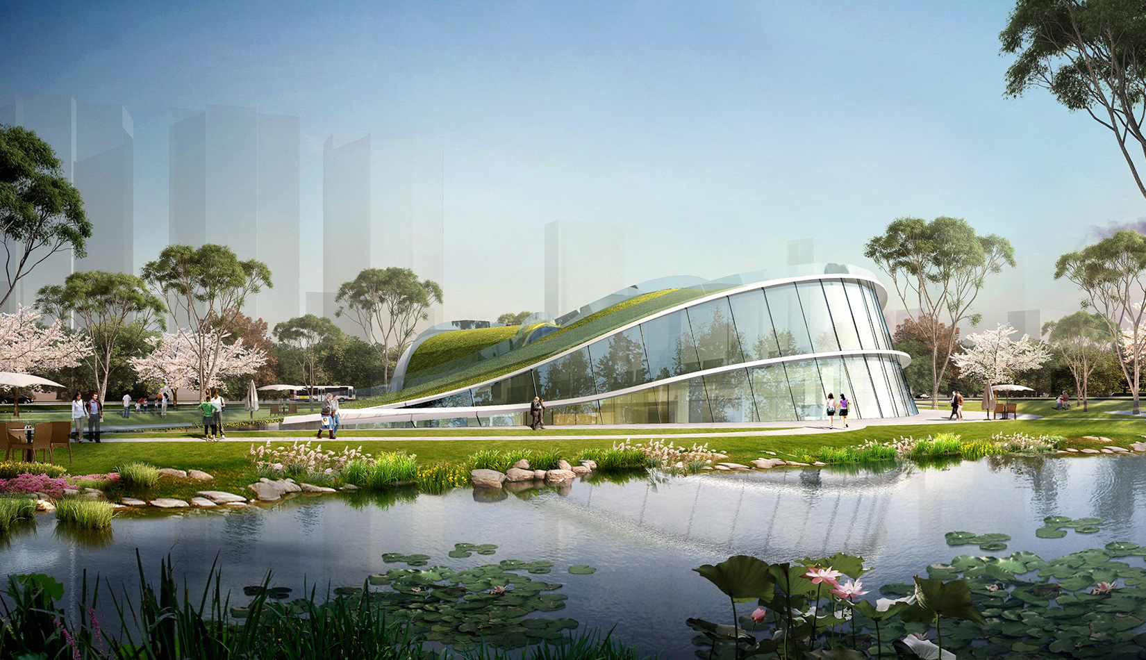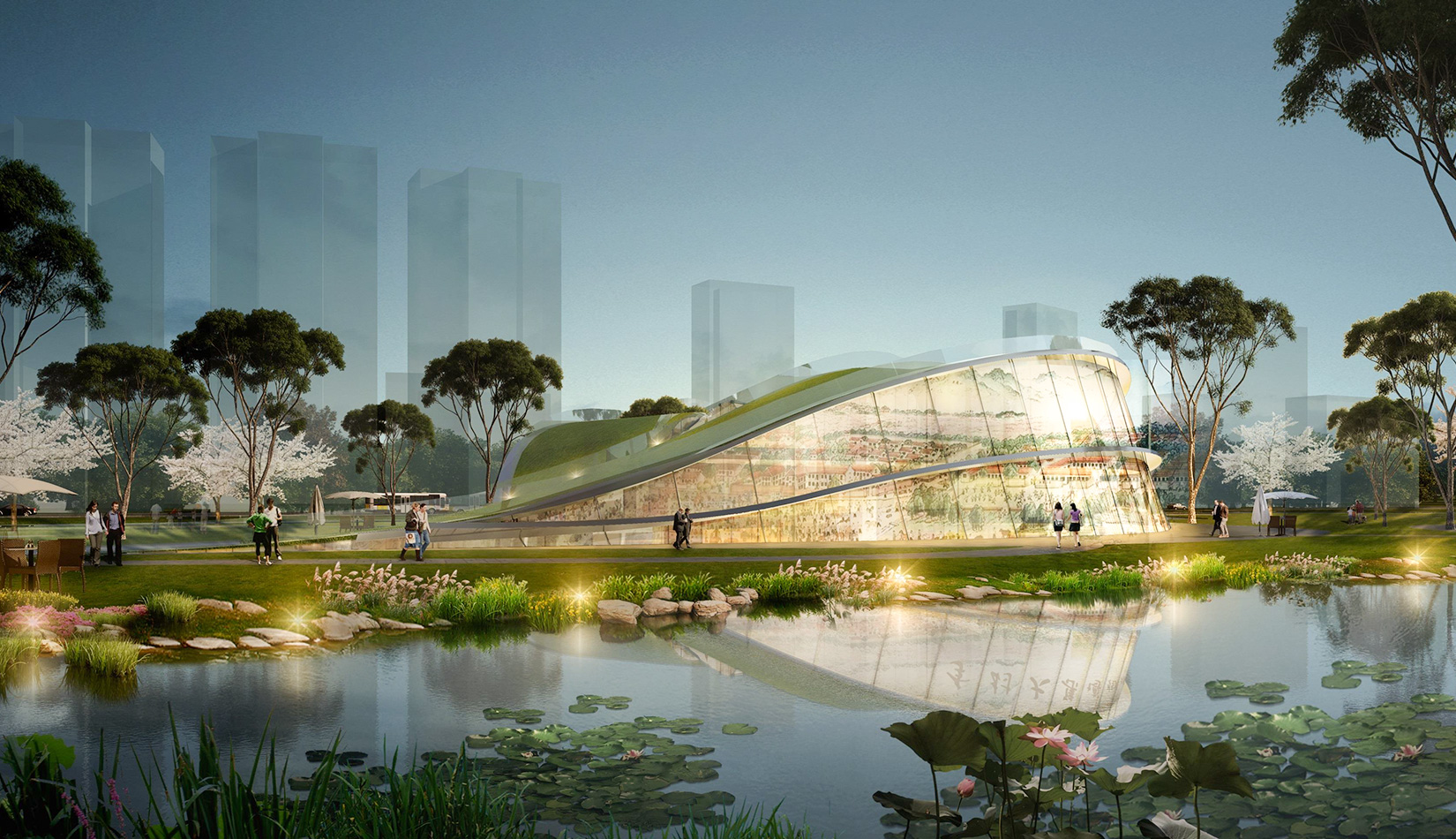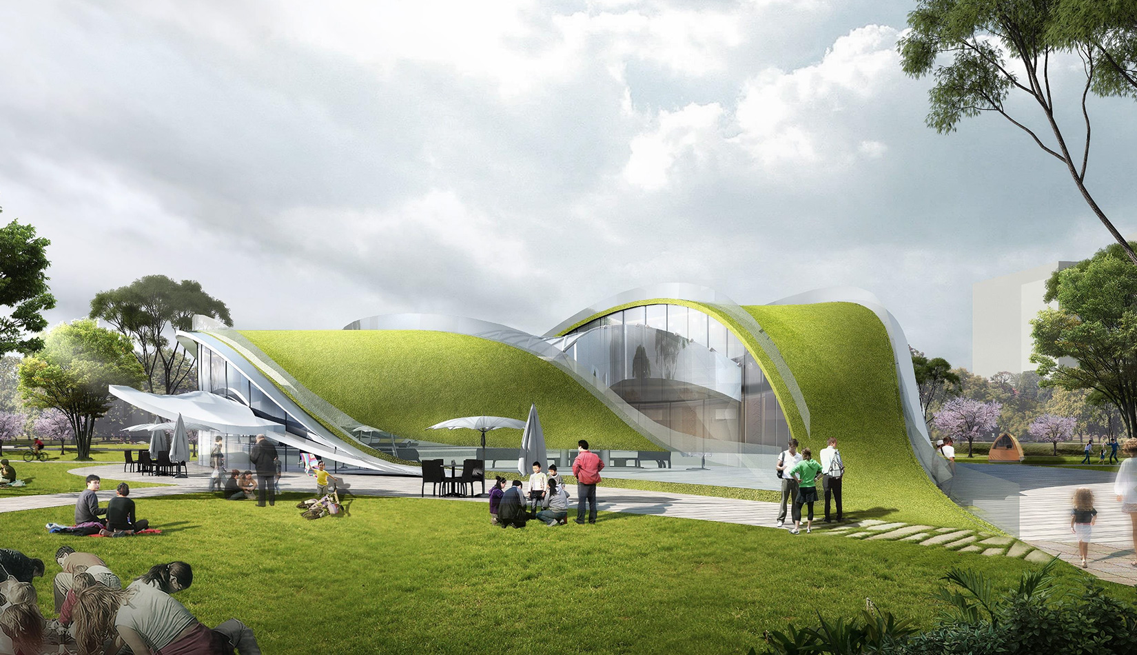 該項目基地位于濱河公園內(nèi),目標要將博物館打造成一個生態(tài)建筑,建筑能與環(huán)境有機融合。在這一理念下,將博物館設(shè)計為樹葉形,建筑猶如一片樹葉飄落在公園內(nèi),以此體現(xiàn)建筑與環(huán)境的融合。將樹葉形建筑設(shè)計為覆土建筑,最大程度還原基地一片綠色,以此呼應(yīng)李村大集的“還原”內(nèi)涵。通過設(shè)計兩個曲線形體相互交融形成建筑的最終體量,以此體現(xiàn)相逢意蘊,呼應(yīng)李村大集的“相逢”內(nèi)涵。